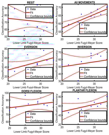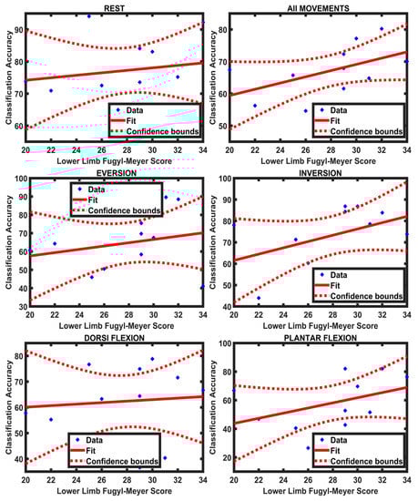 The Spearman correlation was calculated between the lower limb FMA score (section E-F of FMA scale) and the class accuracy across all movements as well as each movement individually for ANN and LDA separately. Furthermore, the coefficient of determination (R2) was also calculated between the lower limb FMA score and the classification accuracy of all movements and each movement separately for both the classifiers. There was a positive, moderate association between the functional scores and the classification accuracies of the motion classes; the results for the correlation analysis and coefficient of determination are presented in Table 2. Additionally, a regression line was fitted to the values of the lower limb FMA score and the average classification accuracy of LDA and ANN for all movements and each movement individually (Figure 7 and Figure 8). It can be observed from Table 2 that the value of R2 for all movements is greater in LDA (R2 = 0.71) compared to ANN (R2 = 0.27). This suggests that LDA was better at identifying a possible trend between the classification accuracies and the lower limb FMA scores.