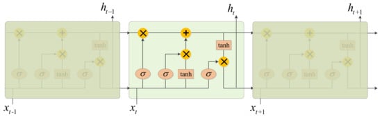 We cascade a BiLSTM behind the DCN to facilitate the extraction of contextual information of features. The BiLSTM network is composed of both forward and reverse LSTM networks []. As shown in Figure 4, the LSTM network contains many LSTM memory cells [] that each includes three control units, namely, an input gate, a forget gate and an output gate. Figure 5 shows a diagram of the LSTM memory cells [].