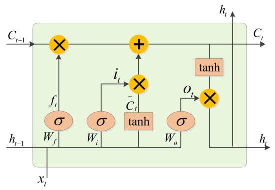 In Figure 5, t represents the current moment. The input feature sequence and the output sequence of the previous time are input to the memory cell. The forgetting factor is obtained via the forgetting gate and is expressed as follows: