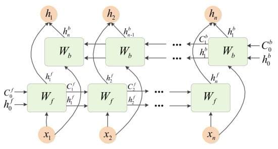 However, a classical LSTM considers only information from the previous moment. To consider both the former moment and the next moment together, the BiLSTM [] adds reverse operations based on the LSTM model in [,]. Figure 6 shows a structural operation graph of the BiLSTM.