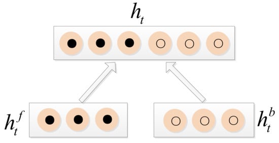 As shown in Figure 6, the BiLSTM reverses the input sequence and calculates the output again in the same way as an LSTM. The final result is a stack of the forward LSTM and the reverse LSTM, which achieves the goal of considering the contextual information. The final outputs of the BiLSTM are , where , can be expressed as shown in Figure 7. The expression of is as follows: