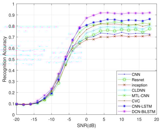 Figure 8 shows that, from −2 to 18 dB, the accuracy of the DCN-BiLSTM network is substantially higher than the accuracy of the other seven recognition algorithms. When the SNR exceeds 4 dB, the recognition accuracy of the DCN-BiLSTM network for the 11 modulation signals can reach 90%.