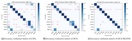 Figure 10 shows confusion matrices for the CNN, DCN and DCN-BiLSTM models when the SNR is 18 dB. According to Figure 10a, it is difficult for the CNN to distinguish QPSK (Quadrature Phase Shift Keying) and 8PSK (8 Phase Shift Keying) because the CNN does not fully extract the phase information: the amplitudes of QPSK and 8PSK are the same and the difference between them is the phase. In addition, 16QAM (16 Quadrature Amplitude Modulation) is often misrecognized as 64QAM (64 Quadrature Amplitude Modulation) because the constellation points of 16QAM can be found in the constellation points of 64QAM.