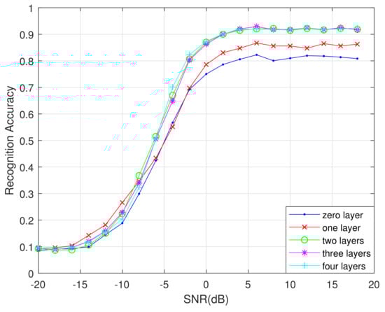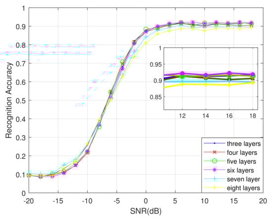 As shown in Figure 11, the overall recognition rate is the highest with six DCN layers when the SNR is greater than 2 dB. With fewer than six layers, the network’s ability to extract phase features is not strong enough. With more than six layers, the network extracts redundant features, and the recognition rate no longer improves, which wastes memory. Therefore, the best number of DCN layers for this algorithm is six.