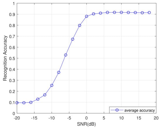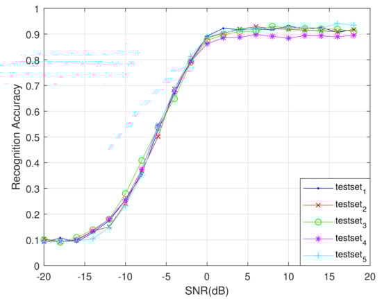 To evaluate the performance of the network proposed in this article, we used the five-fold cross-validation method to train and test the network in this part. We divide the dataset into five parts equally, and use one part as the test sets each time and the remaining four parts as the training sets. Finally we obtained five training and test results, as shown in Figure 13. The average recognition rate curve of these five times is shown in Figure 14. As shown in Figure 13 and Figure 14, when SNR is greater than 4 dB, the recognition accuracy of the proposed network is more than 90% under five trainings, covering the entire dataset, which illustrates the rationality and stability of the designed network.