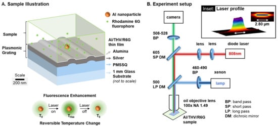 Herein, we report a R6G aggregate-based nanothermometer built upon a plasmonic grating platform fabricated by nanoimprint soft lithography [52,54]. The nanothermography system is used to analyze the spatiotemporal thermal response of photothermally heated Al NPs embedded within a tetrafluoroethylene, hexafluoropropylene, and vinylidene fluoride (THV) polymer matrix. R6G dye molecules were dispersed at sufficient concentration to form dimer aggregates in a micron thick Al NP/THV/R6G nanocomposite film. Individual Al NPs were heated using a high-power-density laser integrated into a tabletop upright microscope with a high-resolution CMOS camera for obtaining spatiotemporal image sequences of the dye response. The time-resolved fluorescence was converted to temperature maps via controlled calibration, and the temperature-dependent response was used to calculate the volumetric heat generation rate of the Al NP.