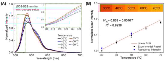 The relationship between temperature and fluorescence intensity was calibrated based upon the lower wavelength/higher energy component of the R6G fluorescence spectrum, namely, the range that experiences the highest relative increase in intensity with increasing temperature (Figure 2A). To accommodate this also in the microscope, we designed a custom fluorescence filter cube that includes 460–490 nm band-pass excitation filter, 500 nm dichroic mirror, and 508–528 nm band-pass emission filter (Figure 1B). The sample was placed under the microscope objective on a closed-loop heating stage with an embedded thermocouple. The stage was slowly heated from 30 and 70 °C in 10 °C increments. After a dwell time of 15 min to achieve steady state, several images were acquired from different areas of the sample at each temperature. Fluorescence intensity was extracted from the images using ImageJ software for later conversion to temperature maps [60].