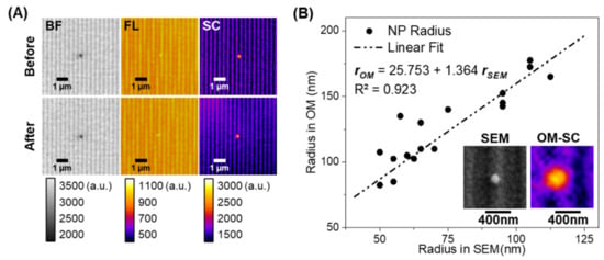 (A) Single Al NP imaged before and after laser-induced heating using brightfield (BF), fluorescence (FL), and polarization-based scattering (SC) modes. (Note: images are false color with intensity indicated by the intensity bars. (B) SEM and polarization-based scattering optical microscope images are used to calculate the ratio to measure the actual dimension of the nanoparticle. (Inset) SEM and optical microscope scattering (OM-SC) images of the same Al NP at the same relative scale.