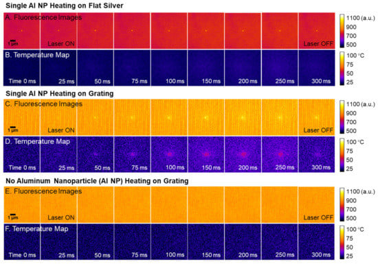 The mechanism of Al NP photothermal heating occurs via absorption of incident photons at the surface of the nanoparticle [71], which excite electrons and generate phonons through electron-lattice relaxation processes [72]. Thermal conduction spreads the heat within the nanoparticle and to the surrounding THV film. Figure 4 shows sample sequential fluorescence micrographs of the Al NP-R6G-THV nanocomposite in different platform and experimental conditions to demonstrate the importance of grating coupling on the elucidation of laser-induced heating. Notably, the embedded Al NPs supported on a flat silver substrate do not show an appreciable increase in temperature, as seen in the converted temperature map (Figure 4A,B).