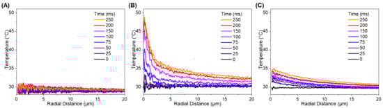 The time sequence of radial temperature profiles during laser irradiation. (A) The laser initially irradiated Al/THV/R6G film on a grating substrate with the absence of Al NP. Radial temperature profiles from the temperature maps of heated 120-nm Al NP supported on a (B) plasmonic grating and (C) flat silver substrates showing time-sequence before (at 0 ms) and during laser-induced heating.