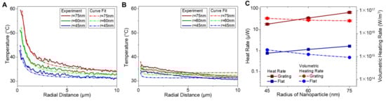 The heat generation rate of the central Al NP can be estimated from the radial temperature profile of the THV [49]. For a first-order approximation, the system was treated as a homogeneous THV slab with a point heating source. The resulting temperature profile is radially symmetric such that the steady state temperature profile may be readily obtained from the heat diffusion equation. Denoted as “curve fit data” in Figure 6A,B, the temperature profile of the THV matrix was fit to an assumed solution of , where and are the curve fit constants, and is the radial distance from the center nanoparticle. Note that the fit was performed preferentially to the first micron of the radial distribution, as the thickness of the film, convection from the top of the THV film, and losses to the grating substrate will invalidate the spherical approximation. Nevertheless, the approximation holds relatively well for radial distances that far exceed the thickness of the film. Origin software was utilized to enable the curve fits of the experimental data. The radial temperature derivatives, namely, the heat transfer rate and the volumetric heating rate shown in Figure 6C, can readily be obtained from the approximation of experimental temperature profiles. Data points and standard deviation error bars were based on four experimental measurements for nanoparticle heating experiments on the silver grating (Figure S4).