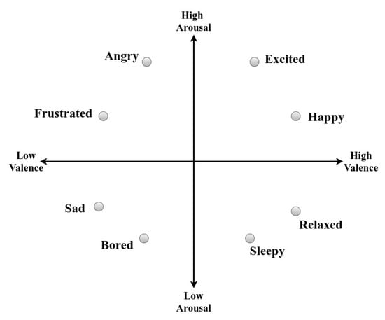 This dimensional emotion model (DEM) holds human emotion in dimension structure, where each dimension represents a characteristic of emotion. In multi-dimensional space, each emotion can be placed as a continuous and coordinated point in 3D or 2D. Instead of choosing discrete emotional state labels, a person’s impression can be indicated on a variety of continuous or discrete scales such as pleasant–unpleasant, attention–rejection or valence–arousal–dominance (VAD) [28]. The most widely used model under DEM is VAD, where valence is a satisfaction varying from positive to negative, arousal reflects the strength of feelings ranging from calm to excited, and dominance is the degree of control that varies from controlled to in control. Dominance is difficult to calculate and is mostly omitted, leading to the two-dimensional valence–arousal (VA) space commonly used [29]. Apart from these, there are many multi-dimensional emotional models present in literature. Typical examples are