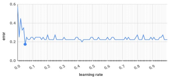 where signifies the learning rate or step size. In practice, the learning rate value is set between 0 and 1. Researchers have noticed that a large learning rate () makes the convergence too fast, having less exploration, which implies bad generalization; on the other hand, small makes the algorithm converge too slow, which means more exploration and implies good generalization but less exploitation. Therefore, in practice, researchers try to balance exploration and exploitation by setting the learning rate () properly. Mostly, it is selected with experiments, but the range should be between 0 and 1.