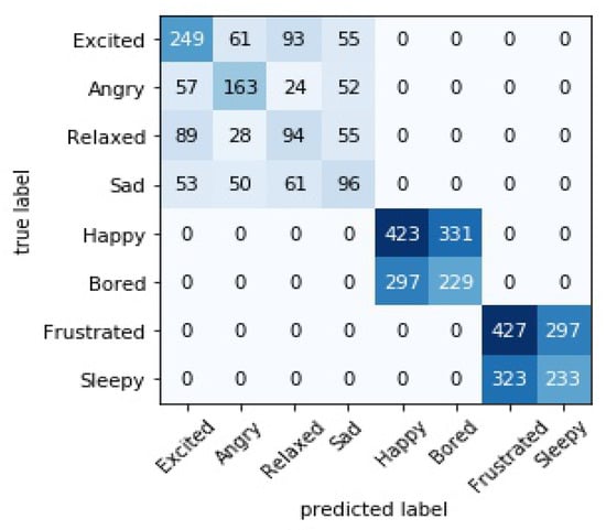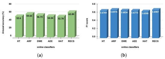 In [13,14], the authors have shown that by integrating emotional states into the learning management system, learners’ understanding, engagement and motivation will improve. Additionally, emotional information opens up the possibility to extend the use of educational technology and to offer potential incentives for enhancing e-learning outcomes (such as new and easily understandable content preparation, customized and personalized learning). It should be stressed that the authors in [13,14] did not process an EEG data set, yet their experiment is useful for integrating the EEG-based emotion classifiers into an e-Learning management system.