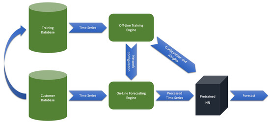 The entire system consists of two separate and independent subsystems called as offline and online engines. The offline engine performs a model training for a network with some predefined configuration and on a global training database containing time series with diverse behaviors. The final weights, together with the configuration, define the pretrained NN-model. We store the configuration and weights in a cloud (as a file in the “json” format) for on-demand access. The global database should be regularly updated by new time series data across different customers and environments. As a result, the pretrained model would be regularly updated. The online engine corresponds to a customer cloud-computing environment. An APM software restores the weights and configuration of the pretrained network from the file. First, the engine retrieves the configuration for data processing. Second, it restores also the weights and applies the model to the processed time series data for a forecasting. The offline mode requires GPU-powered data centers. The online mode is the customer common computing space without a GPU-acceleration.