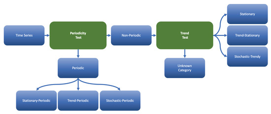 Time series data categorization is the crucial milestone for our approach. Application of NN-models and deep learning for time series classification should be explored elsewhere [36]. In the current research, we restrict ourselves by the classical hypothesis testing methods for trend and seasonality detection. Each data category identifies the set of transformations that will convert any class-representative into a stationary time series. For example, we detect deterministic and stochastic trends via KPSS-test [37] and ADF-test [38,39,40,41,42], respectively. They have the best combined power for data with moderate length. Deterministic seasonality can be tested via Fourier analysis which treats data in the frequency domain [19]. It reveals only sinusoidal patterns in data. We implemented the simplest approach known as phase dispersion minimization (PDM) test [43,44,45] which treats data in the time domain. It is applicable for data with few observations, with nonregular sampling, with gaps and with nonsinusoidal periodicities. In general, multiseasonality can be tested with several period-lags which should be considered elsewhere. Stochastic seasonality can be tested via CH-test [46], HEGY-test [47], OCSB-test [48] and more [49,50,51,52]. In this article, we only test the deterministic seasonality. Stochastic seasonality will be considered elsewhere.
