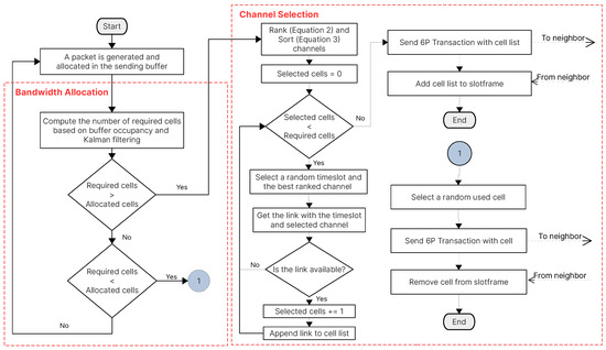 21], which uses a Cell Estimation Algorithm (CEA) to calculate the number of cells required for communication plus over-provision cells to reduce the probability of packet loss in case more cells are required. Channel selection in SF0 is performed randomly. An Allocation Policy (AP) module uses Packet Delivery Ratio (PDR) statistics to monitor currently allocated cells for relocation in the case when PDR measurements are below a certain threshold. Chang et al. [