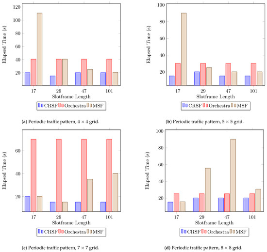 Results for first packet reception (in seconds) with a periodic traffic pattern.