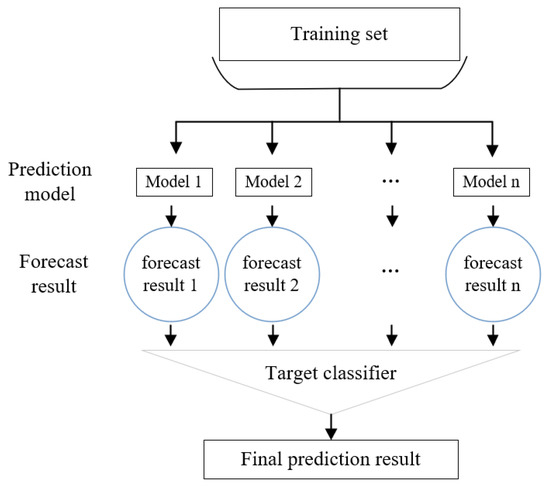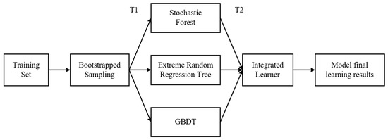 We then use the second layer learner to train and predict to obtain the final regression prediction result. One notable aspect is that the features in and are the results predicted by y in the first layer. The implementation flowchart of the stacking algorithm is shown in Figure 3.