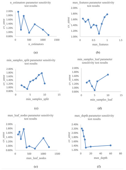 As can be observed from Figure 5, the results of sensitivity testing show that when the parameter min_samples_split is 4, the error rate is the lowest. When the parameter min_samples_leaf is 5, the error rate is the lowest. When the parameter max_depth is 10, it no longer greatly influences the error rate. The experimental results show that these three parameters min_samples_split, min_samples_leaf and max_depth are insensitive and do not need to tune. The values can be min_samples_split = 4, min_samples_leaf = 5 and max_depth = 10.