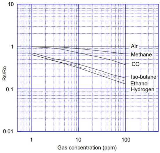 The experimental platform utilized a wind tunnel with two independent gas sources. Each source was controlled independently to release the selected volatiles, which generated different concentration levels in the sensors’ position. The wind generator created a turbulent flow that constantly displaced the introduced volatiles towards the exhaust outlet. The detection platform was composed of 8 MOX gas sensors that generate a time-dependent multivariate response to the different gas stimuli. The operating temperature of the sensors was controlled by the built-in heater, which was kept at a constant voltage of 5 V. Figure 6 is a picture in the technical manual of TGS2600, describing the change of resistance with gas concentration. is the sensor resistance value in various gas concentrations. is the resistance value of the sensor in the clean air.