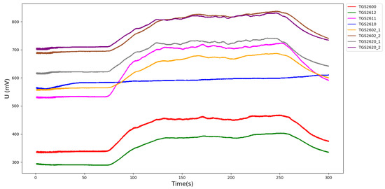 The loop voltage is unchanged. After contacting the target gas, the resistance value changes, the resistance value of the sensor decreases, the resistance value of the load increases, thus, the voltage value increases. Therefore, the data set of the voltage value can be used to detect the type of mixed gas. The sensor response diagram of the experiment is shown in Figure 7 (in the case of Et_L_Me_H, that is under conditions of low concentration of ethylene and high concentration of methane, there are 26,887 columns in this data set), the abscissa is time and the ordinate is the converted sensor voltage value.