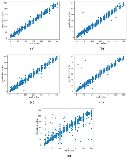 Comparison diagram of fitting algorithms. (a) Stacking algorithm prediction result. (b) Blending algorithm prediction result. (c) Bagging algorithm prediction result. (d) Averaging algorithm prediction result. (e) SVR algorithm prediction result.