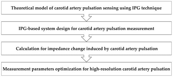 The flow chart of the methodology of our study was presented in Figure 1. First, the theoretical model of IPG-based carotid pulse measurement was established. Second, the IPG device was designed for testing the concept. Third, the calculation method for impedance change induced by carotid artery pulsation was provided. Forth, the influence of different measurement parameters on IPG-based arterial pulsation was evaluated to determine the optimized measurement solution for carotid pulse sensing.