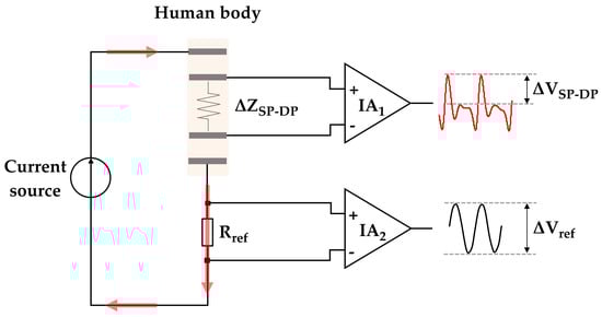 To measure the arterial impedance change during the systolic phase (SP) and diastolic phase (DP), the proportional method was utilized for the impedance measurement, as shown in Figure 4. The reference resistor of Rref was connected to the IPG electrodes and current source in series. Two instrumentation amplifiers (IA1 and IA2) were used with the same components of OPA124. By assuming that the non-inverting and inverting terminals of IA can be neglected owing to ultra-high input impedance, thus ensuring the consistent current pass through the human body and reference resistor. Based on the Ohm’s raw, the voltage difference (ΔVref) over the known resistor Rref was used to calculate the impedance change in the artery between systolic and diastolic phases (ΔZSP-DP) [] through the measured voltage change in the artery (ΔVSP-DP), according to Equation (7):