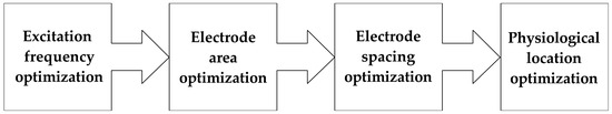 The experiment was permitted by the Institutional Review Board of National Chiao Tung University (NCTU-REC-109-012E). A total of six healthy subjects (three males and three females) participated in the experiment, with the age of 21 ± 2 years, the height of 168 ± 9 cm, the weight of 70 ± 18 kg. The measurement experiments were performed on the neck of the participants by medical tape (Nexcare™ Micropore 17003, 3M™, St. Paul, MN, USA). In the installation of bio-impedance electrodes, two pieces of tape with the same length of 8 cm were used to attach the end of the electrodes to provide a consistent pressure during the bio-impedance measurement. All subjects agreed with the research ethics and were instructed to remain in a sitting position. The experimental flow chart was demonstrated to investigate the influence of measurement parameters (excitation frequency, electrode area, electrode spacing, and physiological location) on IPG resolution, as shown in Figure 5.
