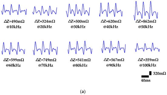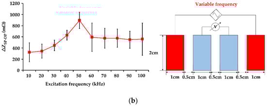The different frequencies of the driving current were performed (10 kHz–100 kHz) to evaluate the influence of excitation frequency on IPG measurement. In this assessment, the spacing of electrodes was an isometric arrangement with a spacing of 0.5 cm and the electrode area was 2 cm2. The electrode was placed above the right neck above the carotid artery of the subjects. Figure 6a demonstrates IPG morphology in different frequencies from 10 kHz to 100 kHz for subject 1. Figure 6b shows that a frequency of 50 kHz obtained a larger impedance difference (ΔZSP-DP) of 895 mΩ than others.