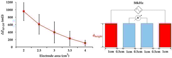 To investigate the IPG measurement resolution from arterial pulsation, the different electrode area from 2 cm2 to 4 cm2 was provided. In the measurement experiment, the electrode spacing and current excitation frequency were 0.5 cm and 50 kHz. The experimental results demonstrate that the smaller electrode cross-sectional area of 2 cm2 provided higher resolution (ΔZSP-DP = 956 mΩ), as shown in Figure 7.