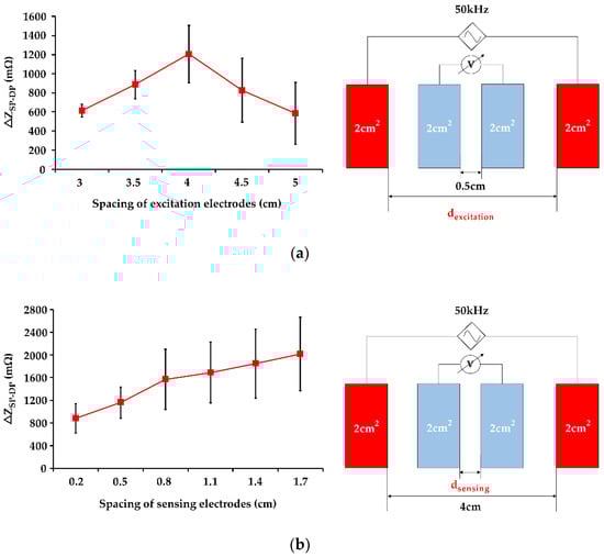 The electrode placement also affects IPG measurement resolution [,]. To explore the influence of IPG electrode placement on the carotid artery, the spacing of excitation and sensing electrodes were evaluated for high-resolution IPG measurement. The excitation electrodes employ for conducting the driving current to pass through the artery regions. The spacing of the excitation electrode could affect the penetration depth of the current below the skin. To obtain the obvious impedance change in response to the arterial pulsation, the different spacing of excitation electrodes from 3 cm to 5 cm were evaluated. In this experiment, the spacing of the sensing electrode was determined by 0.5 cm. Figure 8a shows that a spacing of 4 cm obtained a higher IPG measurement resolution (ΔZSP-DP = 1206 mΩ). The sensing electrodes were utilized to detect the real-time arterial impedance under continuous and consistent current excitation. The variable spacing of sensing electrodes from 0.2 cm to 1.7 cm was provided to investigate the influence of sensing spacing on IPG measurement resolution. Figure 8b shows that the impedance difference enlarged as increasing the distance of sensing electrodes. A spacing of 1.7 cm reached the better IPG measurement resolution of ΔZSP-DP = 2015 mΩ.