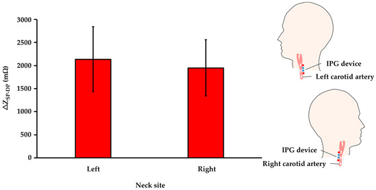 To investigate the influence of the carotid arteries in the left and right sides of the neck on IPG measurement, simultaneous IPG recording was performed in this study. Two same IPG systems were installed above the carotid arteries in right and left neck with consistent excitation frequency, electrode area, and electrode spacing. The comparison results show that the arterial impedance changes on the left side of the neck obtained a higher impedance difference of 2137 mΩ than the right side of 1949 mΩ, as shown in Figure 9.
