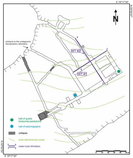 Because of HPs properties such as small size of the measuring base as well as onehundred time lower sensitivity than WTs, the HPs provide much less information about the current state of tectonic activity of the ŚU than WTs. Additionally, the WTs register vertical motions of rock blocks that are in the measurement range of the WTs. Because of the numerous faults across the line of the WTs tubes (Figure 4) the effects of vertical motions of rock blocks provide in general stronger signals than effects of tilting of foundation.