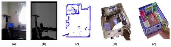 Several types of data provided by the Robot-at-Home dataset: (a) RGB image, (b) depth image, (c) 2D LiDAR map, (d) 3D room reconstruction, and (e) 3D room semantic reconstruction [].