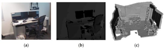 Microsoft 7 Scenes is a multi-modal dataset released by Microsoft in 2013. The dataset contains seven scenes, and the data collection is completed by 640 × 480 resolution hand-held Kinect RGB-D camera []. Each scene in the dataset contains 500–1000 sets of data, and each set of data is divided into three parts (as shown in Figure 3): a RGB image, a depth image, and a 4 × 4 pose matrix from camera to world homogeneous coordinate system. For each scene, the dataset is divided into a training set and a test set. In addition, the truncated signed distance function (TSDF) volume of the scene is also provided in the dataset. Users can use these data as the basis of multi-modal information fusion, or directly reconstruct the scene using the TSDF volumes provided by the dataset. In 2013, Ben Glocker et al. proposed a camera relocalization method based on Microsoft 7 Scenes, which achieved a good result []. Jamie Shotton et al. proposed an approach which employs a camera relocalization method based on regression forest, which was performed on the Microsoft 7 Scenes dataset [].