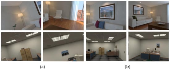 The ICL-NUIM RGB-D Benchmark Dataset is a dataset released by Imperial College London and the National University of Ireland in 2014. It simulates the agent motion and visual sensor posture in 3D virtual scenes []. The dataset contains two basic scenes: the living room and the office. There are 4601 sets of image data in each scene. Each group of data includes a RGB image, a depth image, and a 4 × 4 matrix, which describes the camera pose. For each scene, two different view modes are designed by the dataset: one is to simulate the free movement of the camera in the scene, and the collected images have a variety of perspectives (as shown in Figure 4a); the other is that the camera rotates and moves at a certain height, and the collected images only have a head-up perspective (as shown in Figure 4b). Images from different perspectives can correspond to different application scenarios. For example, multi-perspective view images may be more suitable for simulating the indoor UAV [], while head-up perspective view images are closer to the motion state of mobile robots [,].