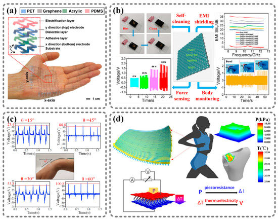 Nanogenerator-based self-powered sensors that directly reflect environmental status. (a) Graphene-based stretchable triboelectric nanogenerator (TENG): wearable self-powered touch sensor [44]. (b) As-synthesized Ag nanowires and PVDF(polyvinylidene fluoride)-based composite: PVDF-based sensor for force sensing and body monitoring [45]. (c) Printed silk-fibroin-based triboelectric nanogenerators: triboelectric nanogenerator (TENG) for angle sensing [46]. (d) Poly(3,4-ethylenedioxythiophene):poly(styrene sulfonate) (PEDOT:PSS)-based 3D thermoelectric spacer fabric: self-powered pressure-temperature sensing e-skin [47]. Reproduced with permission from Elsevier [44,46] and American Chemical Society [45,47].