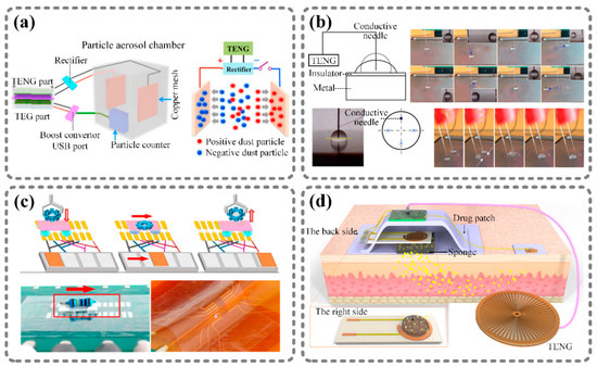 TENGs are known for their high voltage output, which enables them to operate like pumps in order to move particles, including solid particles and liquid particles. The particles are forced to move in a direction decided by the electric field generated by the TENG. Many efforts have focused on this mechanism and realized particle control technologies, including for air purification [57], microfluidics [58], and drug delivery [59]. Four particle control technologies are illustrated in Figure 3.