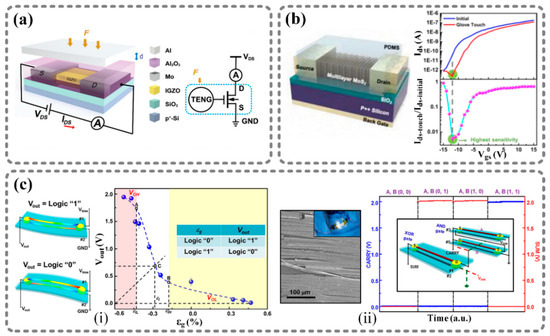 Using nanoenergy to directly modulate electronic signals and construct novel components. (a) InGaZnO thin-film transistor: TENG-based tribotronic thin-film transistor for tactile detection [66]. (b) Tribotronic MoS2 touch memory: zero-writing-power tribotronic touch memory [67]. (c) Epitaxial GaN nanobelt: logic devices based on piezoelectric transistors [68]. (i) GaN nanobelt piezotronic inverter. (ii) Piezotronic half-adder composed of GaN nanobelt piezotronic NAND and NOR logic gates. Reproduced with permission from John Wiley and Sons [66], Elsevier [67], and American Chemical Society [68].