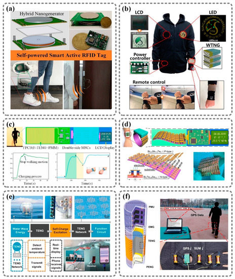 Figure 5a shows a self-powered active RFID tag [31]. This RFID tag is powered by a wearable triboelectric–electromagnetic hybrid nanogenerator. This nanogenerator, which is embedded in shoes, can harvest mechanical energy while a person walks. The collected energy is stored in capacitors through a power management module, which increases the energy conversion efficiency. Then, the energy is converted into 3.3 V DC power with little ripples, which is suitable for powering a Bluetooth chip integrated with an MCU. With a stable power supply from the nanogenerator, the RFID system can work sustainably, autonomously, and omnidirectionally in a large area of up to tens of meters. For wearable electronics, textile-based devices have attracted much attention because they are comfortable to carry. As shown in Figure 5b, a “self-powered smart suit” integrated with LCD, LEDs, and remote control has been reported [70]. The smart suit is powered by a textile-based TENG. This textile-based TENG, which consists of polydimethylsiloxane (PDMS)-coated ZnO nanorod arrays on a silver-coated textile substrate and a silver-coated textile, is attached to the sleeve of the smart suit to harvest mechanical energy. Importantly, a power controller is used in the smart suit to store and distribute energy.