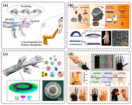 Nanoenergy is collected, analyzed, and converted into standard control signals through a signal-regulating process in order to realize human–machine interfaces. (a) Silicon rubber triboelectric patch: a 3D motion control interface for a robotic manipulator based on TENGs [77]. (b) PEDOT:PSS-coated textile: an intuitive glove-based interface for machine control. [78]. (c) Flexible wearable triboelectric patch: a wearable multi-functional human machine interface [79]. (d) Joint motion triboelectric quantization sensor: a system for the synchronous action of a human and a robotic hand [80]. Reproduced with permission from Elsevier [78,79,80] and American Chemical Society [77].