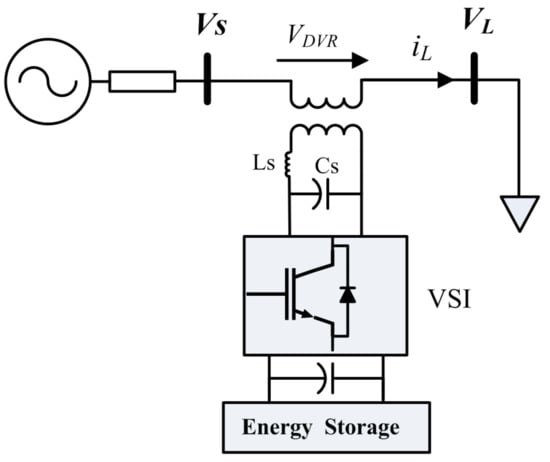 Figure 3 represents the DVR power circuit. It can protect the sensitive loads from destructive effects of voltage drop. It essentially consists of an injection transformer, a low pass filter to eliminate the high order harmonics, which represented by Lf and Cf, a voltage source inverter (VSI), and an energy storage system (ESS). In this paper, the pulse-wide-modulation (PWM) technique is used to control the VSI. To restitute the load voltage at the pre-fault time, the DVR will inject a voltage to compensate the voltage drop. In order to increase the voltage, the active power capacity of the ESS is a limiting factor. This is important, especially for mitigating long duration voltage sag [42,43]. To compensate the voltage sag by the DVR, several control techniques have been proposed in the literature. They are classified into pre-sag [42], in-phase [43], and minimal energy [44] methods.