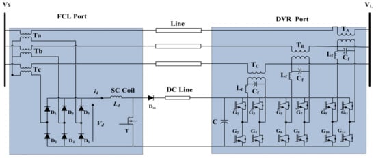 Figure 4 shows the BSFCL-DVR power circuit. It is mainly composed of three single-phase VSIs (i.e., IGBT G1–G4, G5–G8, and G9–G12), inverter output filter (Lf − Cf), bridge rectifier circuit (D1–D6), a boost regulator (MOSFET T and diode Dm), SC coil (Ld). DC link (C), which is located between the DVR and boost converter. The DVR is located into the load side through three boost transformers (TA, TB, TC) at the end of the feeder, which are the DVR function port. Transformers (Ta, Tb, Tc) are integrated into the SC coil via a three-phase bridge rectifier circuit as an FCL port. Under the operation mode of the grid, the T is closed and the DVR port is used to compensate the load voltage. The current following through the SC is approximately constant, so the FCL port does not effect on the line side.