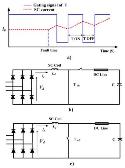 Figure 5 shows the gating signal of the T, operation of the boost chopper for charging the capacitor when T is on and off states under fault condition, respectively. In the fault condition, the circuit operation is divided into two modes. The first mode is shown in Figure 5b. In this mode, T is on and the input voltage across the SC, i.e., Vd is equal to the voltage across the SC and id linearly increases, which leads to raising of energy in the SC. In the second mode, the T is turned off and the SC current flows through the diode (Dm) as demonstrated in Figure 5c. Also, some of the SC energy is transferred to the capacitor and id linearly decreases as shown in Figure 5a. By appropriate switching of T, the DC link voltage remains constant. Simultaneously, the DVR converter injects the AC voltage to the line at the end of the feeder at the load side.