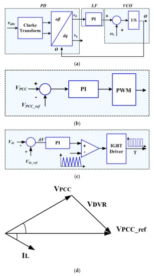 The main functions of the new structure are limiting fault current and compensate the load voltage during a fault condition. The DVR port restored the load voltage to its desired level. In this paper, the phase-locked loop (PLL) synchronization method has been used. Figure 6a demonstrates the block diagram of the PLL, which includes the voltage-controller oscillator (VCO), a phase detector (PD), and a loop filter (LF). Under the fault condition, the PCC voltage (VPCC) is controlled based on the pre-sag compensation strategy. Figure 6b demonstrates the control scheme of the DVR port. The main drawback of this method is the capacity limitation of the ESS to support active power for compensation the voltage sag. But, the BSFCL-DVR system solves this drawback. In the proposed method, the boost converter provides constant DC voltage for the capacitor with absorbing the SC energy stored. Figure 6c,d show the control scheme of the boost chopper regulator and the phasor diagram of the DVR port.