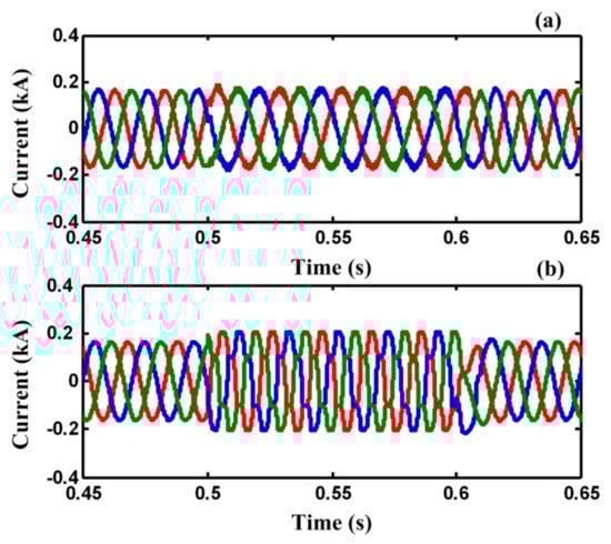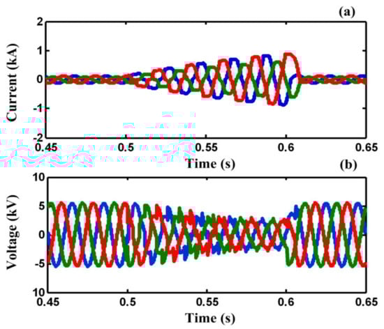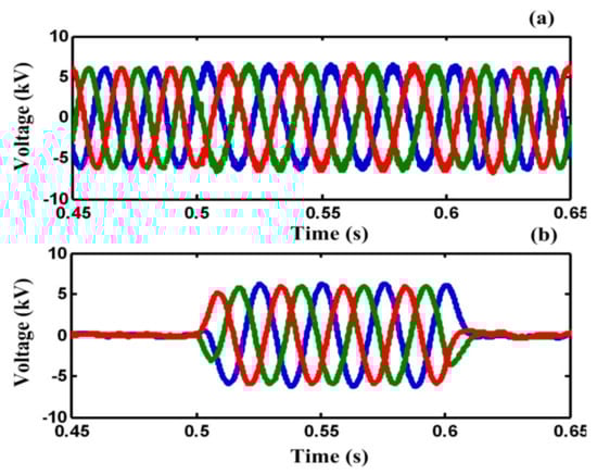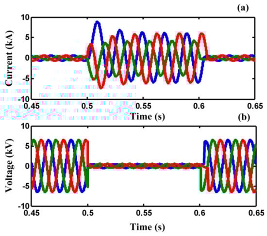 In case A, a three-line-to-ground (3LG) fault happens at t = 0.5 s on feeder 2 (F2). Figure 8a,b demonstrate the line current of F2 and the PCC voltage without using any FCL. As illustrated in Figure 8a,b, the fault current is increased to the peak value of 8 kA and the PCC voltage falls to zero, approximately.