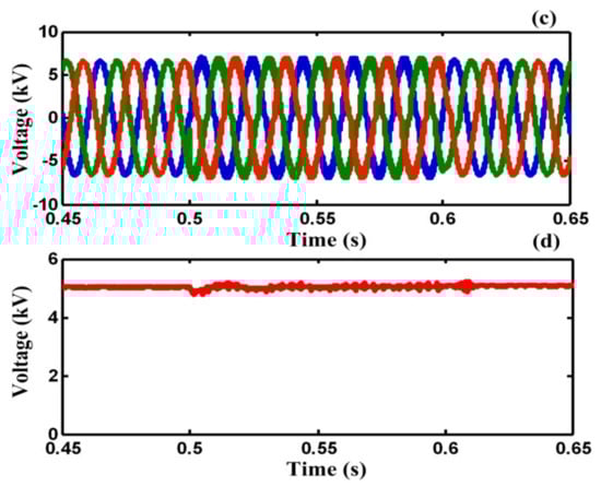 Figure 10a,b illustrate the load voltage and the injected voltage by DVR port in F2 during the fault, respectively. As shown in Figure 10a, by using the proposed DVR-BSFCL structure, the load voltage is compensated to pre-fault voltage in F2. Figure 10c,d show PCC voltage and capacitor voltage, respectively. Although the PCC voltage is distorted during the fault, it is protected from voltage sag.