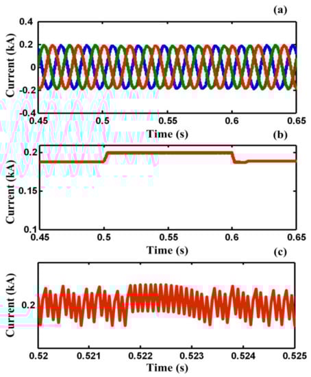 Figure 11 shows the load and fault currents of F2. As shown in Figure 11a, the load current would not be affected by fault occurring and it is protected from momentary outages during the fault. However, the fault current in the F2 effectively is limited by the FCL port and is not increased gradually during the fault. As shown in Table 2, the relative amplitude of harmonic components of PCC voltage in case C is much less than case B. Figure 12a shows the current of common loads connected to PCC during the fault, respectively. It is obvious from Figure 12a that the load current of F1 is protected from voltage sag and momentary outage during the fault. Figure 12b,c show the SC coil current and enlargement SC current during fault, respectively.